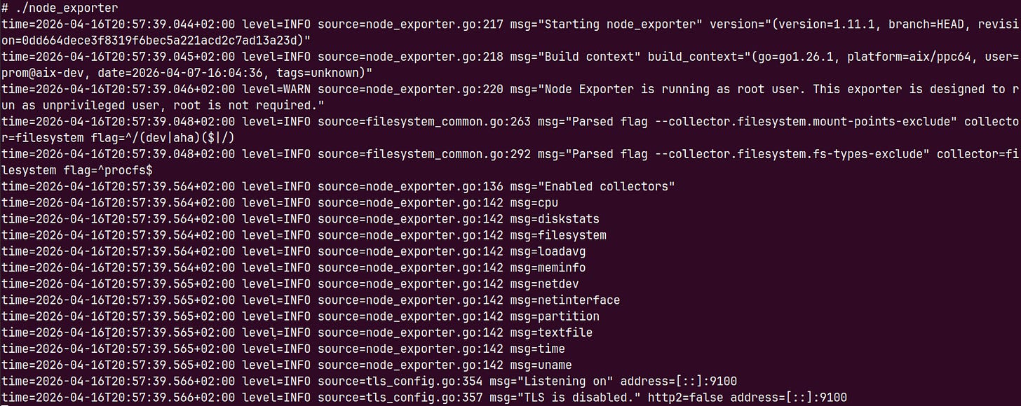 I didn’t do any thorough tests of the new node exporter. I only started it on AIX 7.3 TL3 and checked if it works.
